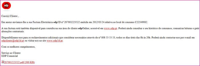 Alertamos para o facto que muitos Clientes estarem a receber emails fraudulentos, em nome da EDP, disponibilizando uma suposta fatura eletrónica emitida em março através de um link contido no email.