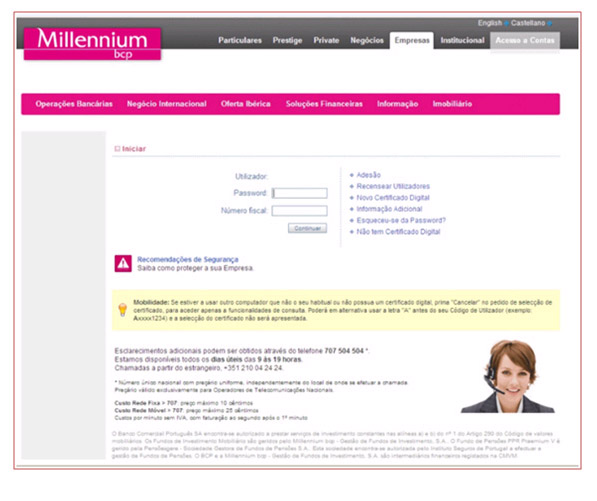 Alertamos para situações irregulares de pedidos de códigos de acesso e dados do telemóvel no acesso ao site empresas do Millennium bcp. Após introdução do Código de Utilizador, surge uma página que solicita a introdução da Password e do Número Fiscal na totalidade.