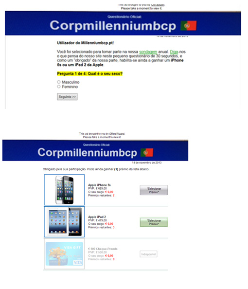 Alertamos os nossos Clientes para o aparecimento, em forma de pop-up, de um falso “Questionário Oficial Millennium bcp” após acederem a www.millenniumbcp.pt.